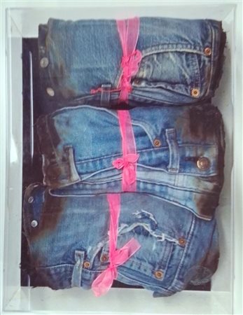 Lotto 20 BERNARD AUBERTIN (1934-2015) Jeans Bruciati in Plexglas Sigillato Anno 2013, Misure del Plexglass CM 40X30X15, Firma e Anno a Mano al Retro, Autentica su Foto dell'Artista e Certificato di Lecita Provenienza