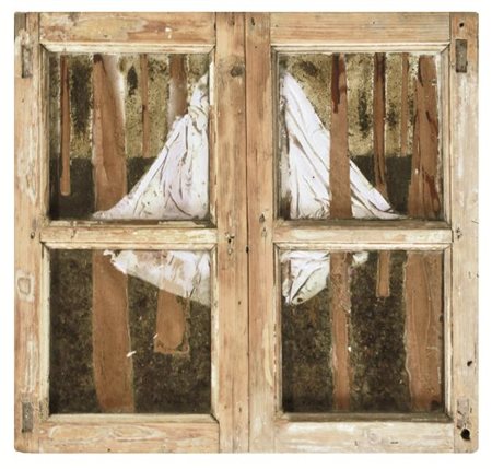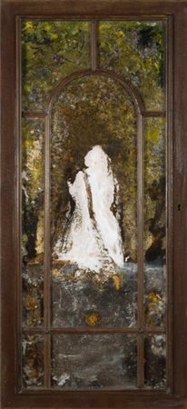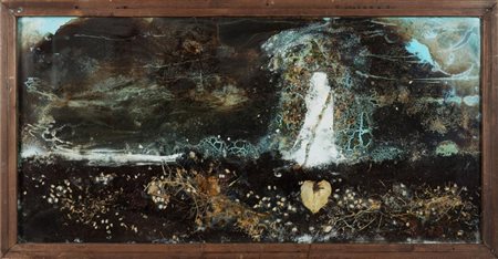 Torba, idropittura, impregnante, fogliame, gommalacca, fiori e frammenti di protesi dentarie su vetro 62x119 cm -