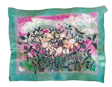 Legno, tessuto, foglie, fiori e gommalacca su vetro 74x80 cm