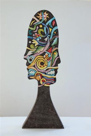 Scultura a tecnica mista. Roccia vulcanica dell'Etna e smalti, legati con cottura a 950 gradi. -