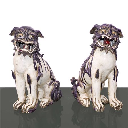 Lotto 1 Coppia di cani di Fo in biscuit smaltato bianco e viola, Japan 19° secolo h cm 31 (cadauno)