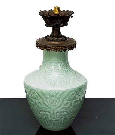 Lotto 2 Grande Vaso cinese in smalto verde con decori adattato a lampada da tavolo h cm 49 Provenienza nobile famiglia belga. Iscrizione sul fondo Provenienza nobile famiglia belga. Iscrizione sul fondo
