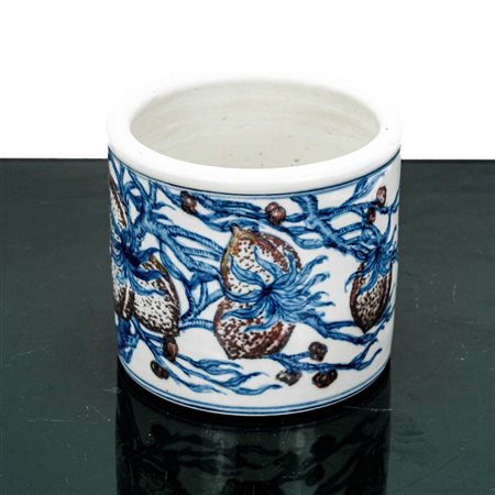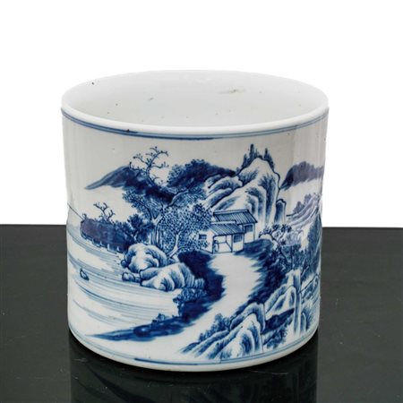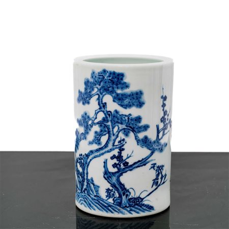 Lotto 10 Vaso cilindrico in porcellana bianca e blu, Qing , dinastia h cm 15 diametro cm 10 Iscrizione sul fondo Iscrizione sul fondo