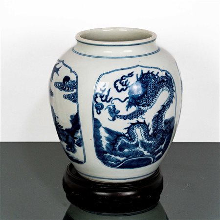 Lotto 7 Vaso blu e bianco con decoro con dragone e leone con base in legno, Qing , dinastia h cm 26X24 con base h cm 28 Iscrizione sul fondo Iscrizione sul fondo