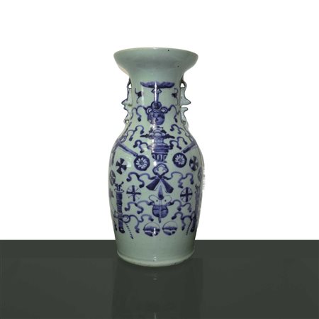 Lotto 8 Vaso cinese in porcellana celadon a decori blu su fondo bianco h cm 42