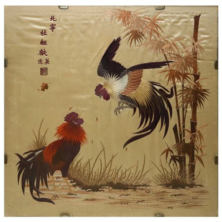 Lotto 23 Galli in combattimento., 19° secolo cm 55,5X55,5 Ricamo su seta Ricamo a caratteri orientali al centro a sinistra