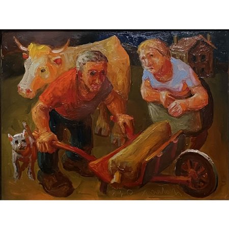 Lotto 17 Fernando Righi, Rustici, olio su cartone,cm 22x28, in cornice dorata, firmato in basso a dx.