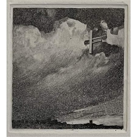 Lotto 16 Luigi Bonazza - Incisione dedicata a Giovanni Battista Caproni, cm 8,5 x 8. In cornice cm 45x38. Non firmata. In basso a dx presente sigillo con motto coniato da Gabriele D'Annunzio per la Caproni "Senza Cozzar dirocco".