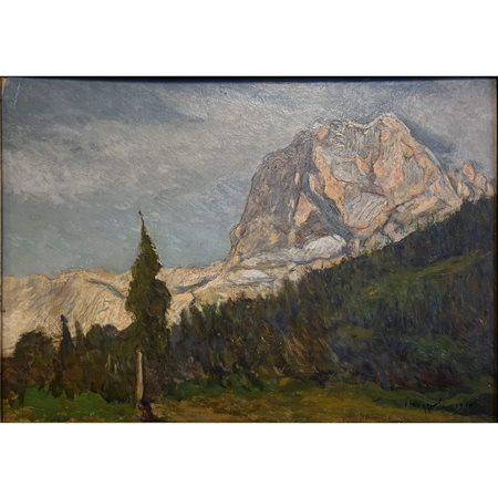 Lotto 20 Umberto Moggioli (1915) Paesaggio, olio su compensato, 27x38 cm. Con cornice cm 32x43. Firmato in basso a dx. Opera esposta presso il Palazzo Conti Martini, sede di rappresentanza della Cassa Rurale di Mezzocorona