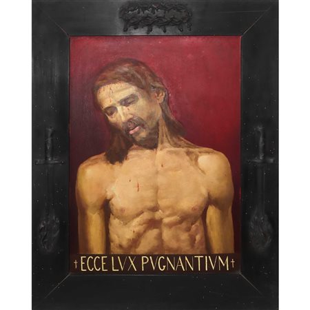 Lotto 5 Ecce Homo, 20° secolo H cm 82 x 58 / in cornice 107 x 83 Olio su metallo Cornice di legno nero intagliato,scritta in basso ECCE LVX PVGNANTIVM