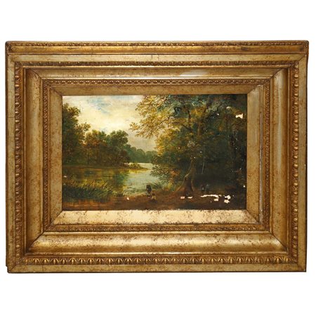 Lotto 12 Paesaggio fluviale con personaggi h cm 30,5X46 in cornice h cm 55,5X70,5 Olio su tela Cadute di colore