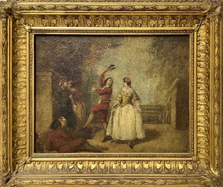 Lotto 17 Scena di balli popolari con personaggi en plein air, 19° secolo H cm 23 x 29, in cornice H cm 33 x 40 Olio su tavola Pittore degli inizi del XIX Secolo; In cornice dorata in pastiglia