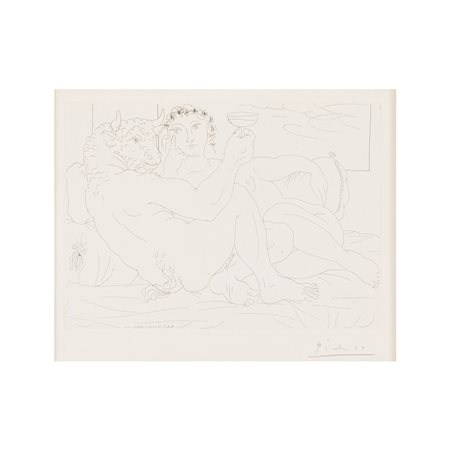 "Minotaure, une coupe à la main, et Jeune Femme" dalla Suite Vollard, 1933, incisione, firmata in basso a destra, entro cornice.