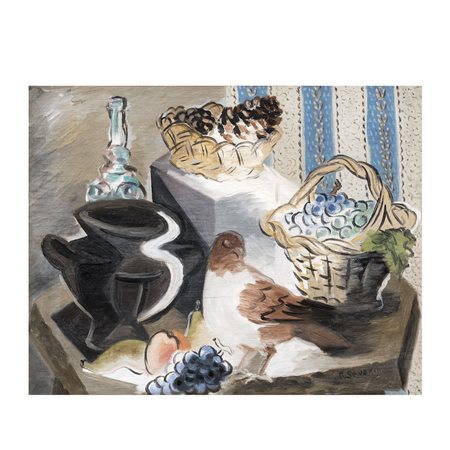 "Natura morta con cesta e piccione", 1942-43, olio su tavola, firmato in basso a destra
