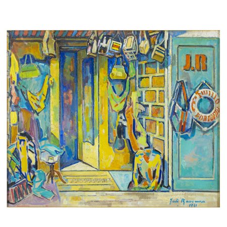 "Boutique della riviera", 1961, olio su compensato, firmato e datato in basso a destra, titolato e datato sul retro, entro cornice -