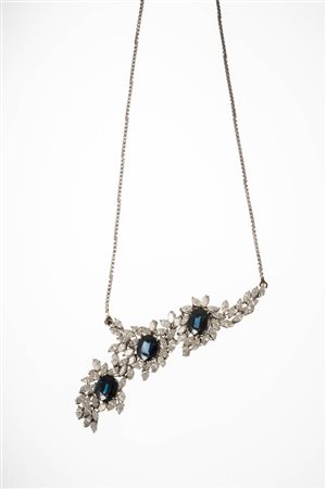 in oro bianco, anni '70, con al centro tre zaffiri taglio ovale per totali ct 8,50 ca e diamanti taglio navette per totali ct 6,0 ca (una mancante), probabile colore G-H, purezza IF-VVS . -