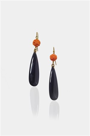 pendenti, amo in oro giallo, con sfere di corallo mediterraneo incise con motivi orientaleggianti e terminanti con due gocce appiattite in onice. -