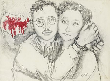 Renato Guttuso Bagheria (Pa) 1912 - Roma 1987 Julius ed Ethel Rosenberg Matita e pastello su carta, cm. 35x48 Firma in basso a destra: Guttuso.