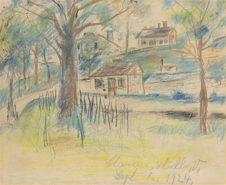 Maurice Utrillo Parigi 1883 - Dax 1955 Paesaggio, 1924 Pastello su carta, cm. 22x26 Firma e data in basso a destra: Maurice Utrillo, V, / Septembre 1924. Certificato su foto di Gilbert Pétridès, Parigi, 11 aprile 2001, con n. 27 527. Strappo nell’angolo in alto a sinistra.