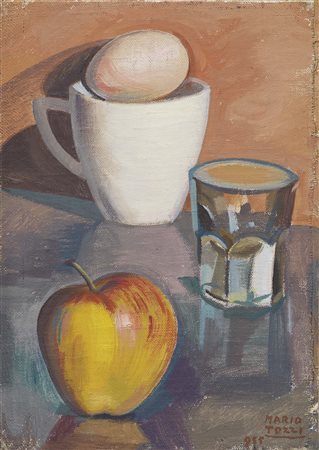 Mario Tozzi Fossombrone (PU) 1895 - St. Jean du Gard 1979 Tazza con l’uovo, bicchiere e mela, 1955 Olio su tela applicata su tavola, cm. 26,5x18,1 Firma e data in basso a destra: Mario / Tozzi / 955. Certificato su foto Archivio Mario Tozzi, Foiano, 8 maggio 2014, con n. 2105 (con supporto errato).