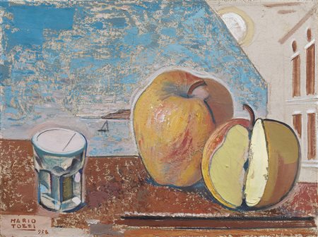 Mario Tozzi Fossombrone (PU) 1895 - St. Jean du Gard 1979 Composizione con mele, 1958 Olio su tela, cm. 31x40 Firma e data in basso a sinistra: Mario / Tozzi / 958. Al verso sulla tela: etichetta Galleria dell’Annunciata / Mostra del pittore Mario Tozzi / dal 30 Ottobre al 20 Novembre / n. 27 / 30 Ottobre 1958: timbro Galleria dell’Annunciata. Storia Collezione privata, Suna; Collezione privata Certificato su foto Archivio Mario Tozzi, Foiano, 8 maggio 2014, con n. 1055. Esposizioni Mostra personale di Mario Tozzi, Milano, Galleria dell’Annunciata, 30 ottobre - 20 novembre 1958. Bibliografia Marilena Pasquali, Catalogo ragionato generale dei dipinti di Mario Tozzi, volume secondo, Giorgio Mondadori, Milano, 1988, p. 48, n. 58/5.