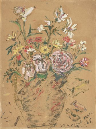 Filippo de Pisis Ferrara 1896 - Milano 1956 Vaso di fiori, (1946) Olio magro su cartone, cm. 50,5x37 Firma, data e luogo in basso a destra: de Pisis / [46] / Milano. Al verso sul cartone: etichetta e due timbri Galleria d’Arte del Naviglio, Milano. Certificato su foto Associazione per il patrocinio dell’opera di Filippo de Pisis, Milano, 5 giugno 2006, con n. 02404.