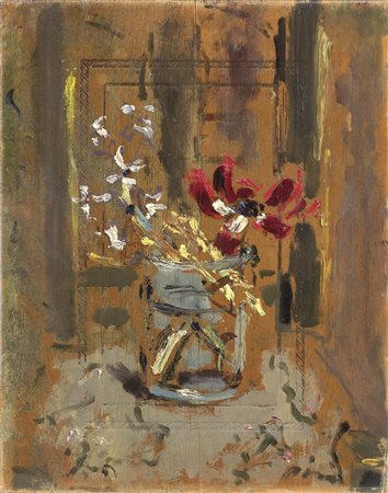 Filippo de Pisis Ferrara 1896 - Milano 1956 Fiori nel bicchiere, 1944 Olio su tavola, cm. 37x29,2 Firma in basso a destra: Pisis, sigla e data in alto a sinistra: SB / 44. Al verso: etichetta VIII Mostra della Piccola Galleria / Venezia / 23 sett. 44: timbro Piccola Galleria, Venezia. Certificato su foto Catalogo dell’Opera di Filippo de Pisis, Milano, 13 marzo 2007, con n. 02911.