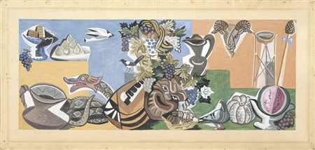 Gino Severini Cortona (Ar) 1883 - Parigi 1966 Hommage à Bacchus, (1936-37) Tempera su carta applicata su tela, cm. 55,5x115 Titolo in basso al centro: Hommage à Bacchus. Dichiarazione di autenticità su foto di Gina Severini Franchina, 28 luglio 85; conferma dell’autenticità di Romana Severini e Daniela Fonti.