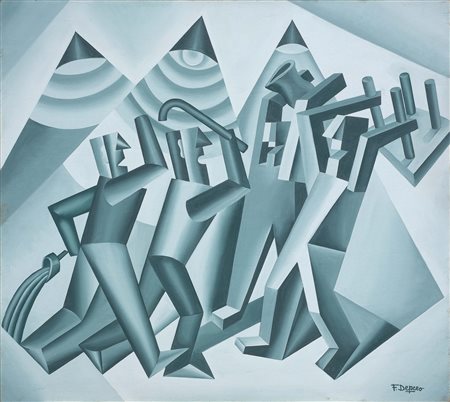 Fortunato Depero Fondo, Val di Non (Tn) 1892 - Rovereto (Tn) 1960 Rissa meccanica, 1947-48 ca. Olio su tavola, cm. 63x70 Firma in basso a destra: F. Depero. Al verso: etichetta e due timbri Galleria d’Arte Il Castello, Trento. Certificato su foto di Bruno Passamani, Brescia, 30 settembre 1982; certificato su foto Galleria d’Arte Il Castello. Opera registrata presso l’Archivio Unico per il Catalogo delle Opere Futuriste di Fortunato Depero, a cura di Maurizio Scudiero, Rovereto, con n. FD-0478-DIP.