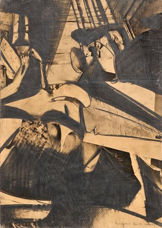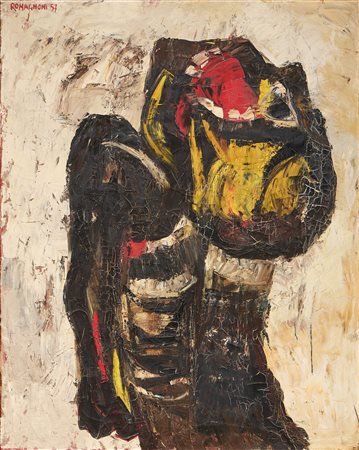 Firma e data in alto a sinistra: Romagnoni 57; firma, titolo e data al verso sulla tela: Romagnoni / Fucilato / 1957; sulla tela e sul telaio: timbro Galleria Bergamini, Milano. -