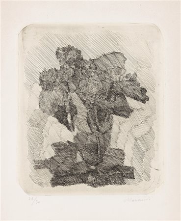 Firma in lastra in basso al centro: Morandi, firma e data a matita sul margine in basso a sinistra: Morandi 1928, tiratura in basso a sinistra: 17/40. Al verso: timbro Galleria del Milione, Milano, con n. 5352/3.