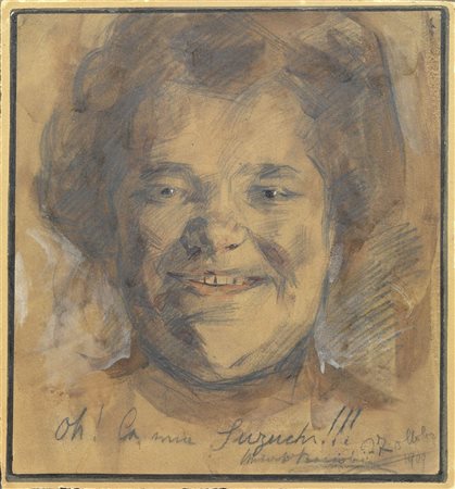 Scritta, firma e data in basso: Oh! la mia Suzuchi!!! / Umberto Boccioni / 27 ottobre / 1909. Al verso: etichetta Civica Galleria d'Arte Moderna, con indicazione di proprietà Betty Baer e n. 3: etichetta Boccioni a Venezia / Dagli anni romani / alla mostra d'estate a Ca' Pesaro / Milano Accademia di Brera 23 Febbraio - 13 Aprile 1986 / Opera Esposta: etichetta Boccioni a Venezia / Dagli anni Romani alla Mostra d'estate a Ca' Pesaro / Galleria dello Scudo / Momenti della stagione futurista / Museo di Castelvecchio / Verona 1 Dicembre 1985 - 16 Febbraio 1986 / Opera Esposta: etichetta Comune di Venezia / Mostra "Boccioni a Venezia" / Chiesa di San Stae - Venezia / 19 aprile - 1 giugno 1986.