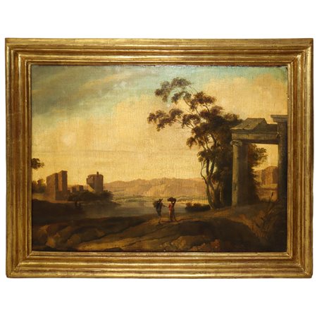 Lotto 4 Paesaggio fluviale con quinta arborea, architetture e personaggiin cammino., 17th/18° secolo, landscape painter h cm 46X62 in cornice h cm 57,5X71 olio su tela Sullo sfondo agglomerato e sulla sinistra torrione con fortificazioni.