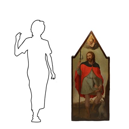 Lotto 11 Francesco Zaganelli (attribuito a) (Cotignola 1460 - Ravenna 1532) - San Rocco, 15th/16° secolo h cm 150X61 profondità della tavola cm 2,5 tempere grasse su tavola cuspidata Opera attribuibile all'area degli Zaganelli. Questo delizioso pannello è probabilmente parte di una struttura più ampia atrribuibile a Francesco Zaganelli, attivo in area ravennate. Possiamo fare riferimento alla Santa Lucia dello stesso Zaganelli il cui stile può essere raffrontato all'opera in questione. Molto probabilmente risale al periodo della sua venuta in Veneto, chiamato a Vicenza a dipingere la Madonna della rose; durante questo soggiorno risente degli influssi veneti e sicuramente viene a contatto con le influenze dureriane di cui la nostra opera in qualche modo risente. L'opera può essere datata intorno ai primi anni del '500, in quanto fino al 1509 lo Zaganelli lavora esclusivamente a tempera