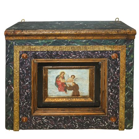 Lotto 12 Madonna con Bambino e San Francesco in cornice scatolata laccata e dorata , 18° secolo h cm 65X73X29