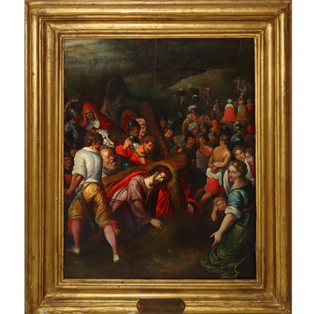 Qui, nella nostra opera, si vede l'esatto contrario del classicismo. Si vede anzi un atteggiamento da parte del pittore che ha eseguito il quadro, di tipo assolutamente manieristico che corrisponde con quanto vi abbiamo notato. I caratteri stilistici del nostro quadro, quindi, sono strettamente connessi con un altro maestro fiammingo operoso nel meridione di Italia nella seconda metà del secolo sedicesimo, Simone De Wobreck. Si tratta di un nome che oggi può risultare meno noto rispetto a un de Vos, ma Simone De Wobreck fu un maestro di primissimo spicco, attivo soprattutto in Sicilia dove creò una importante schiera di discepoli e seguaci. Se si confronta il nostro quadro con un autentico capolavoro del De Wobreck come la maestosa pala d' altare della Circoncisione nella chiesa di San Domenico a Castelvetrano risulta a mio avviso lampante come siamo di fronte alla stessa mano. Analitico e pungente, vivacissimo e proliferante, il nostro quadro è stato creato da un artista della stessa mentalità e della stessa cultura figurativa che vediamo espresse nella pala di Castelvetrano. Peraltro Simone De Wobreck trattò ripetutamente il tema della Salita al calvario, come è ben documentato da almeno due pale d'altare che le fonti gli riferiscono, una già in San Francesco a Caccamo e un'altra nella chiesa di santa Maria Maddalena a Ciminna. Il nostro dipinto, insomma, deve essere considerato un rimarchevole lavoro del manierismo fiammingo in Italia, databile probabilmente tra il nono e il decimo decennio del secolo sedicesimo, negli ultimi anni di vita del De Wobreck che, nato ad Haarlem in data imprecisata ma da collocare nel quarto decennio, risulta scomparso, su base documentaria, intorno al 1596/97." Questo lotto è soggetto a diritto di seguito -