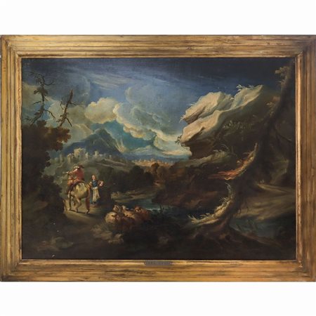 Lotto 24 Paesaggio con personaggi e armenti, 17th/18° secolo cm 94x128 , in cornice cm 118x152 Olio su tela