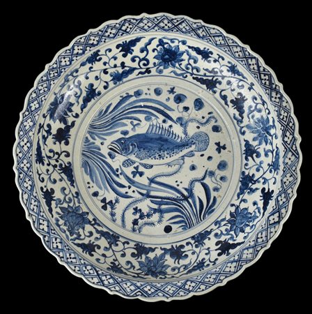 Lotto 0009 Cina, piatto in porcellana bianca e blu decorato con pesce
