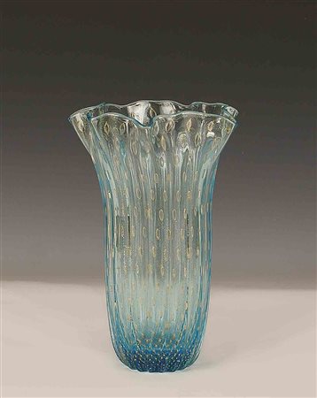 Lotto 3 Vaso portafiori in vetro colorato con profilo smerlato, Murano, h. cm. 25,5.