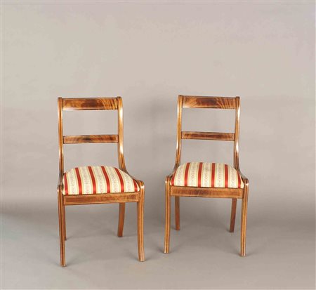 Lotto 13 Sei sedie in mogano filettato in legno di frutto, schienale traforato con sedute imbottite e rivestite in tessuto, h. cm. 85.