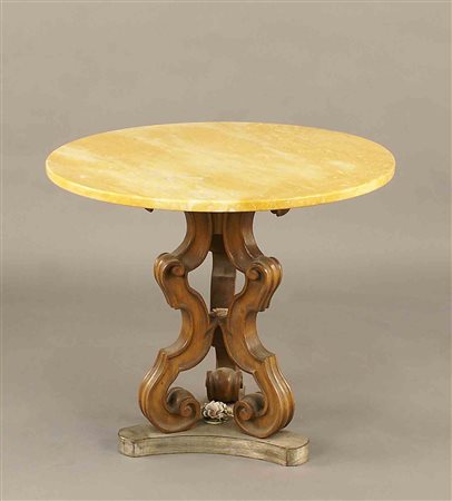 Lotto 18 Tavolino gueridon con piano in marmo giallo di Siena, poggiante su base in legno laccato ed intagliato, vecchia manifattura, h. cm. 51, d. cm. 51.