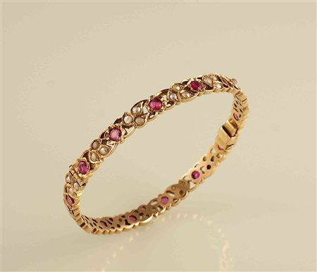Lotto 24 Bracciale a manetta in oro rosso 14kt con incastonati rubini tondi per carati 2 circa alternati a perline, anni 40/50, gr. 14,7.