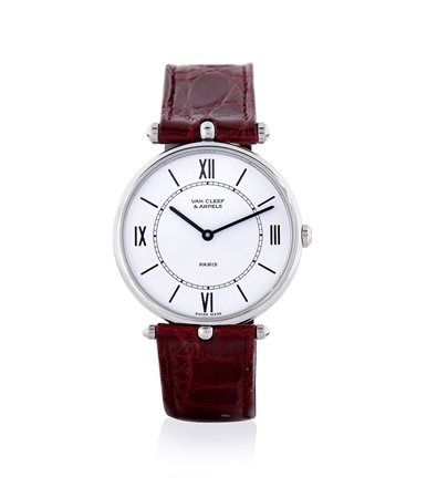 C. stainless steel with central lugs an sapphire crystal. D. white with painted indexes and Roman numerals. M. quartz. Dial, case and movement signed. Accompanied by Van Cleef & Arpels strap and buckle.