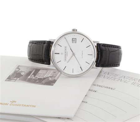 C. 18K white gold with sapphire crystal. D. white with applied indexes, centre seconds and date at 3. M. self-winding. Dial, case and movement signed. Accompanied by Vacheron Constantin strap, 18K white gold buckle, box and certificate dated 03/1999.