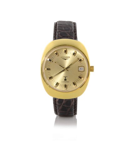C. solid, tonneau-shaped, 18K yellow gold. D. champagne with applied indexes, centre seconds and date at 3. M. quartz. Dial, case and movement signed.