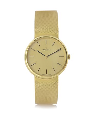 C. 18K yellow gold. D. champagne with applied indexes. M. manual winding. 18K yellow gold integrated bracelet. Dial, case, movement and bracelet signed.