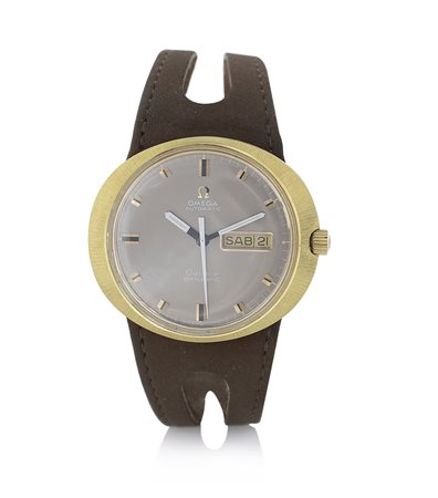 C. oval-shaped, 18K yellow gold with screwed case back. D. bronze with applied indexes, centre seconds, aperture for day and date at 3. M. self-winding. Dial, case and movement signed. Accompanied by Omega strap and buckle.