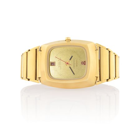 C. massiccia asimmetrica in oro giallo 18 kt con fondello chiuso da viti. Q. in oro giallo con indici smaltati, secondi al centro e data al 6. M. cal. 1300 al diapason. Bracciale massiccio in oro giallo 18 kt. Quadrante, cassa, movimento e bracciale firmati.