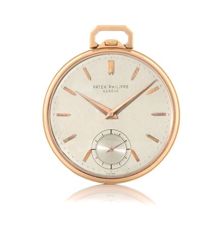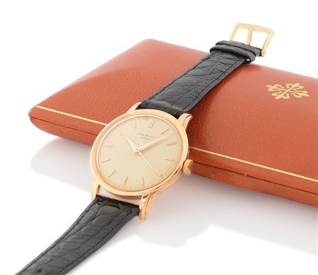 C. 18K pink gold with concave band and fluted lugs. D. silvered with applied indexes. M. cal. 27 SC manual winding. Dial, case and movement signed. Accompanied by Patek Philippe 18K pink gold buckle, box and Extract from the Archives.