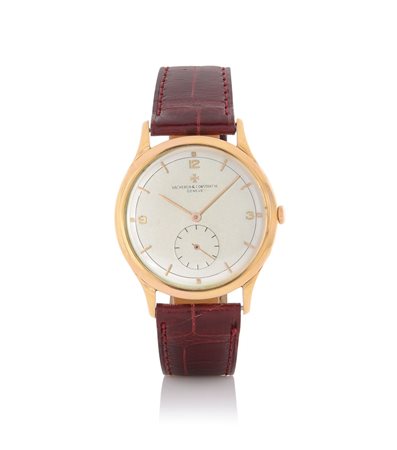 C. openface, 18K pink gold. D. silvered indelible with applied indexes and subsidiary seconds. M. rhodium-finished, keyless dress. Dial, case and movement signed. Accompanied by Extract from the Archives.